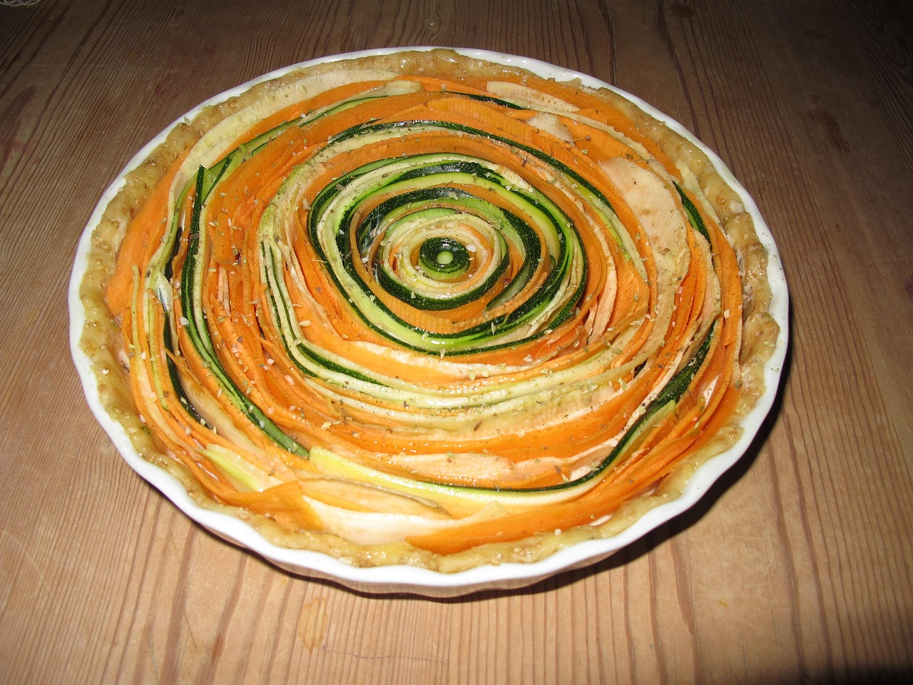 Začněte od okraje formy. Do těsta postupně vkládejte pásky mrkve, cukety a petržele, případně prokládejte tenkými plátky tvrdého sýru. Vrstvy jemně stáčejte směrem ke středu – čím těsněji je naskládáte, tím krásnější spirála vznikne.