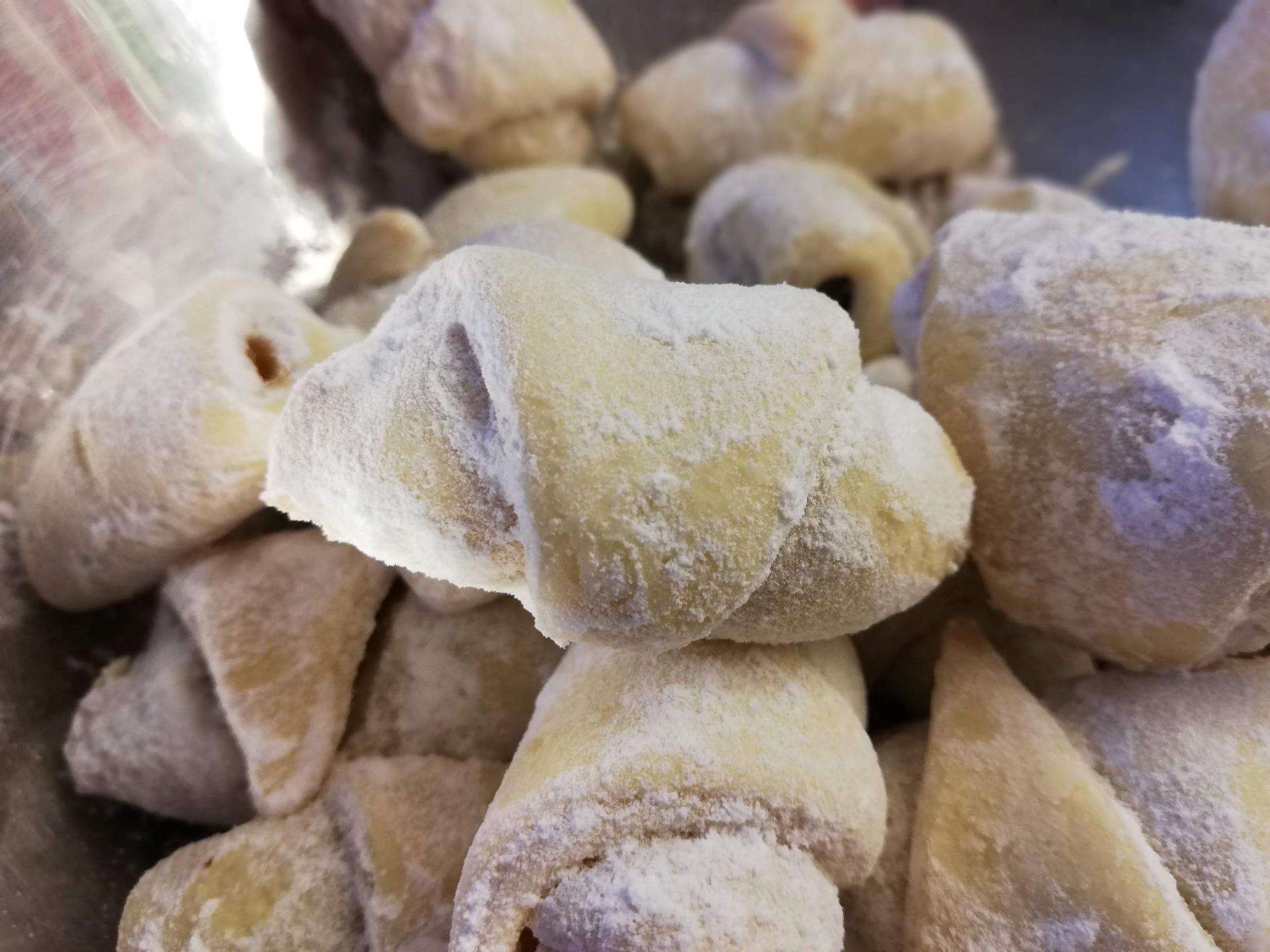 Jak zatočit rohlíček tak, aby náplň nevytekla, uvidíte na videu ZDE. Ty špičky dávejte dolů na plech, ať se vám rohlíčky nerozjedou.