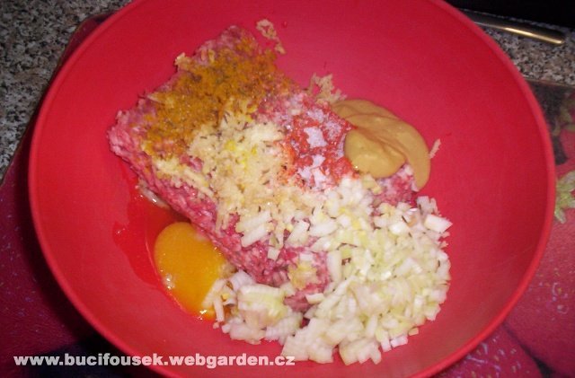 Nejdříve si umícháme mleté maso podobně jako na sekanou. Do mísy nasypeme nadrobno nakrájenou cibulku, prolisujeme česnek, přisypeme kmín, kari, papriku, přidáme hořčici a vejce, vše dochutíme solí, případně maggi. Důkladně prohněteme.