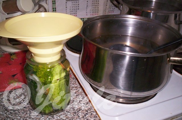 Uvaříme si lák. Používám oba láky – dělám polovinu okurek s mamčiným a polovinu s tetiným. Lák vařím v pětilitrovém hrnci na el. sporáku č.4, dokud se všechno důkladně nesvaří. POZOR POUZE SVAŘIT, NEVAŘIT!!! Když je lák hotový, sporák stáhnu na č.1 a nechám lák nahřívat, abych okurky zalívala stále horkým lákem.